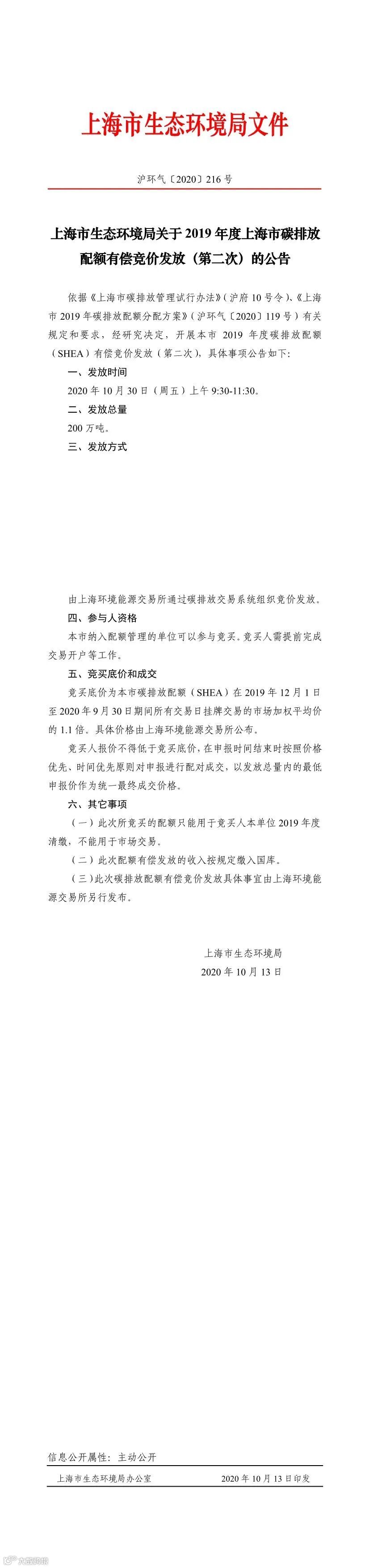 【重要公告】上海市生态环境局关于2019年度上海市碳排放配额有偿竞价发放(第二次)的公告