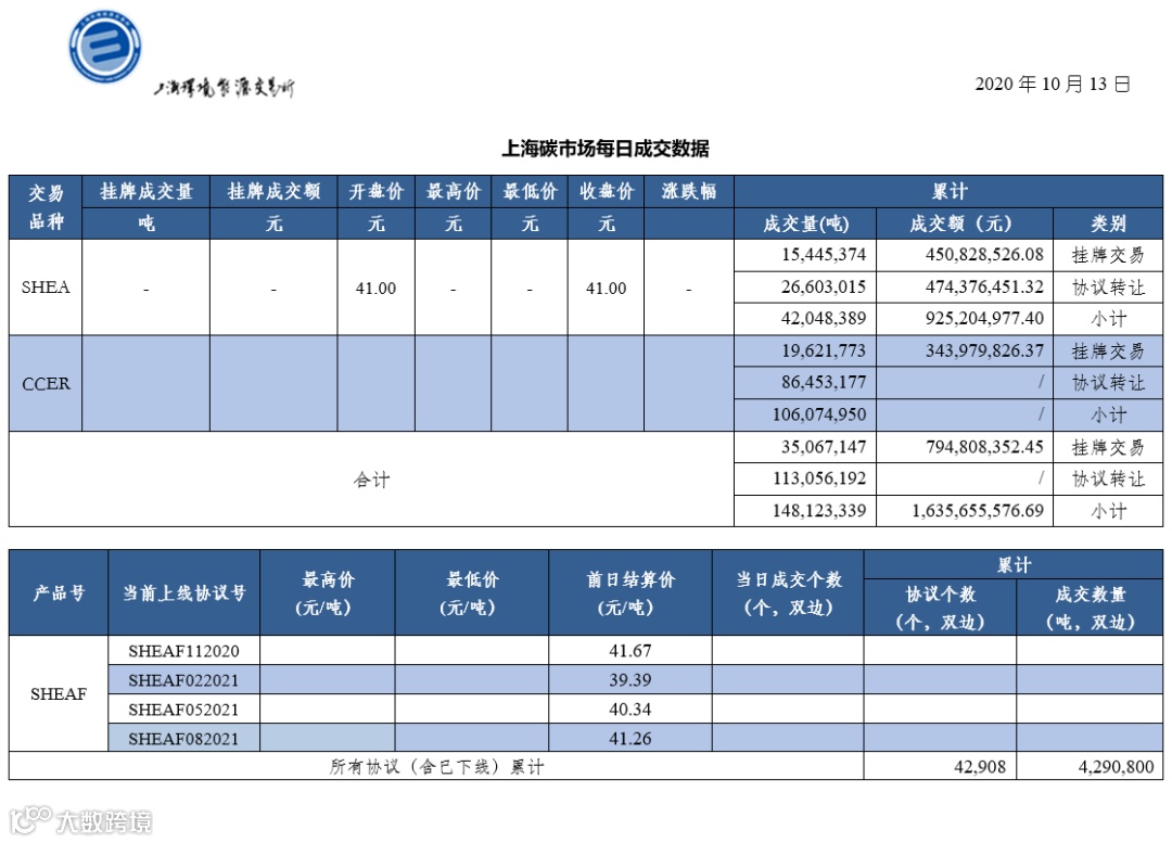截止今日,上海碳市场所有现货品种累计成交量148,123,339吨,累计成交金额1,635,655,576.69元。其中,配额累计成交42,048,389吨,成交金额925,204,977.40元;CCER累计成交量106,074,950吨。上海碳配额远期产品累计成交数量4,290,800吨。