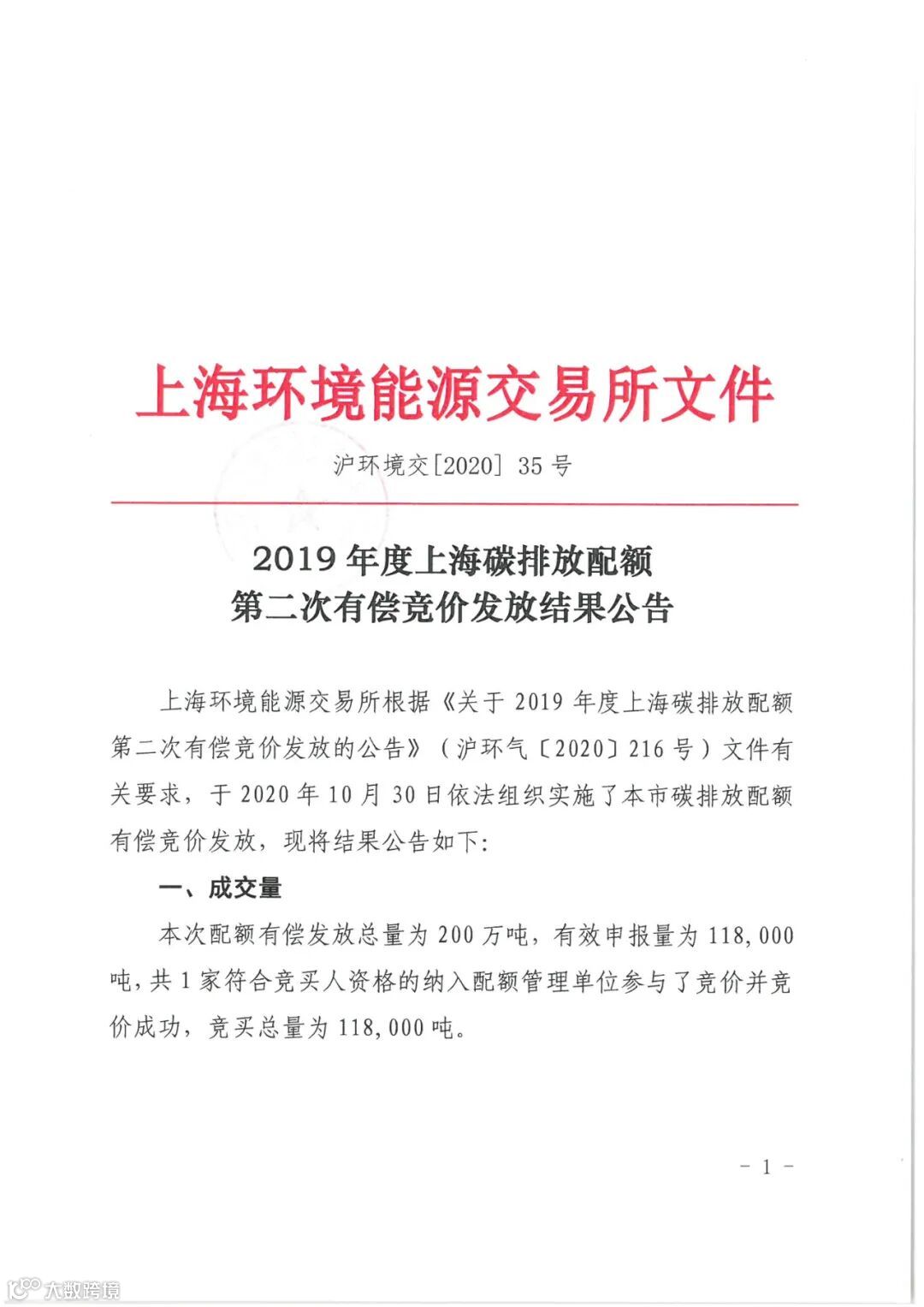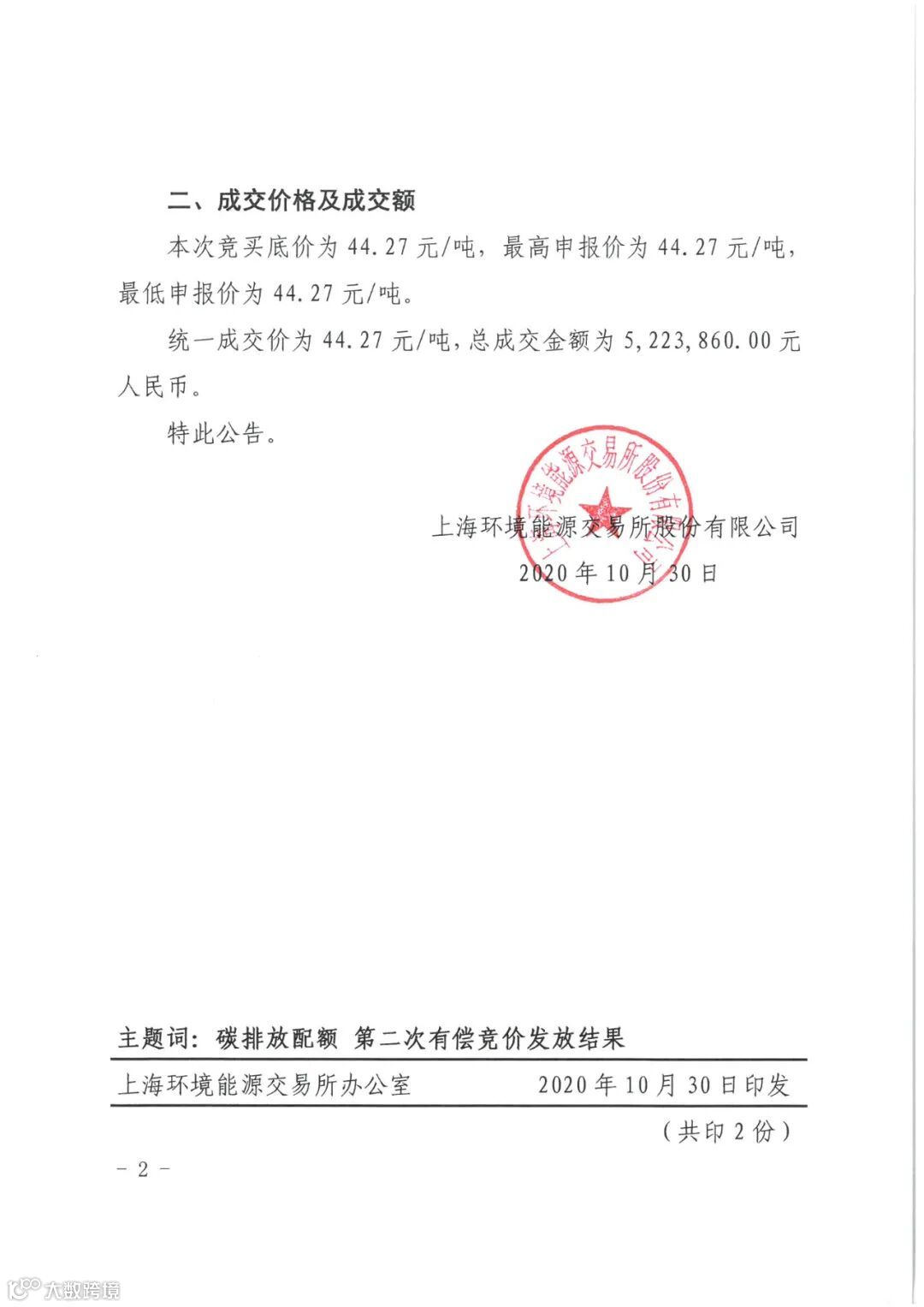 【公告】2019年度上海碳排放配额第二次有偿竞价发放结果公告