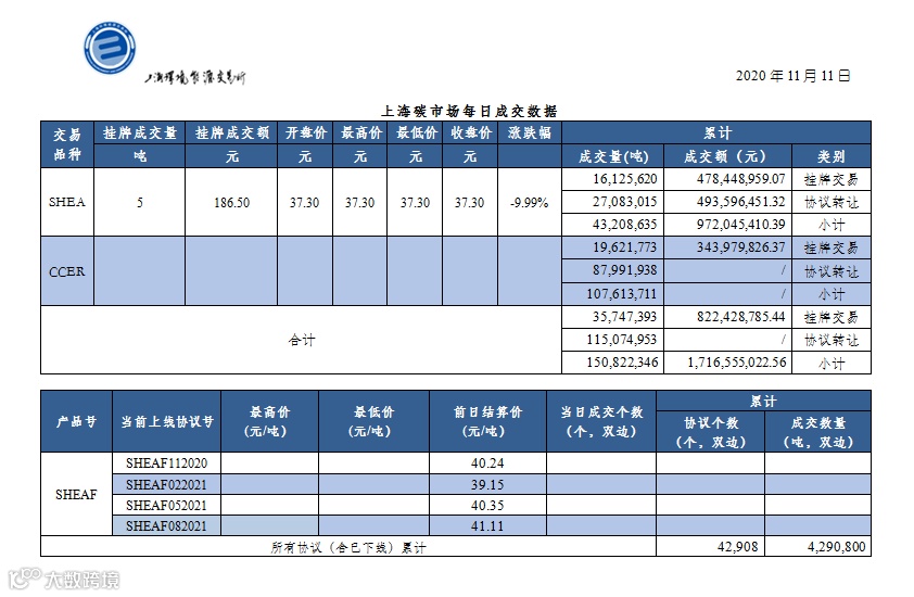 截止今日,上海碳市场所有现货品种累计成交量150,822,346吨,累计成交金额1,716,555,022.56元。其中,配额累计成交43,208,635吨,成交金额972,045,410.39元;CCER累计成交量107,613,711吨。上海碳配额远期产品累计成交数量4,290,800吨。