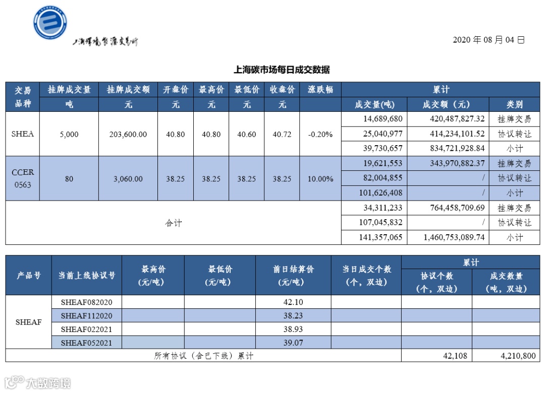 今日上海碳市场SHEA挂牌交易成交5,000吨,成交额203,600.00元,收盘价40.72元/吨,较上一交易日收盘价下跌0.20%;CCER0563挂牌交易成交80吨,成交额3,060.00元,收盘价38.25元/吨,较上一交易日收盘价上涨10.00%;CCER协议转让成交56,949吨。