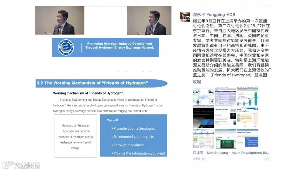 图:上海环境能源交易所总经理助理沈轶发表“氢能交易网助推氢能产业发展”主题演讲,亚洲开发银行可持续发展和气候变化局能源部总监翟永平博士给予高度评价。
