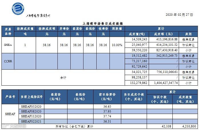 截止今日,上海碳市场所有现货品种累计成交量132,279,862吨,累计成交金额1,404,427,347.74元。其中,配额累计成交39,550,220吨,成交金额827,430,918.40元;CCER累计成交量92,729,642吨。上海碳配额远期产品累计成交数量4,210,800吨。