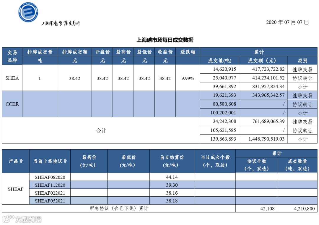 今日上海碳市场SHEA挂牌交易成交1吨,成交额38.42元,收盘价38.42元/吨,较上一交易日收盘价上涨9.99%;CCER协议转让成交200,000吨。