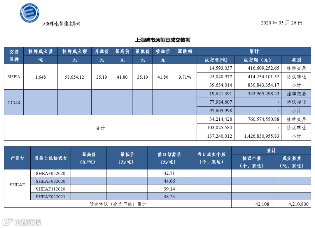 截止今日,上海碳市场所有现货品种累计成交量137,240,012吨,累计成交金额1,426,830,955.83元。其中,配额累计成交39,634,014吨,成交金额830,843,354.17元;CCER累计成交量97,605,998吨。上海碳配额远期产品累计成交数量4,210,800吨。