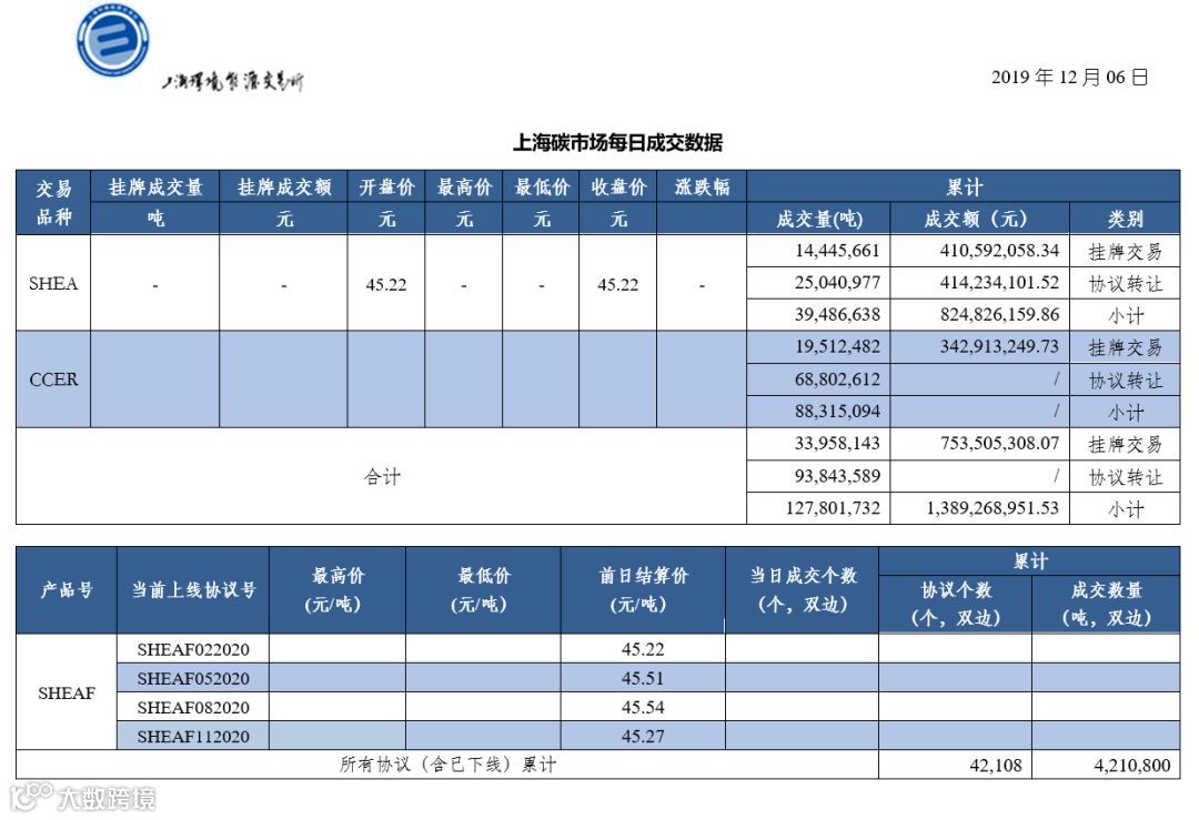 截止今日,上海碳市场所有现货品种累计成交量127,801,732吨,累计成交金额1,389,268,951.53元。其中,配额累计成交量39,486,638吨,成交金额824,826,159.86元;CCER累计成交量88,315,094吨。上海碳配额远期产品累计成交数量4,210,800吨。