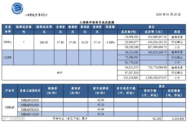 今日上海碳市场SHEA挂牌交易成交7吨,成交额260.00元,收盘价37.14元/吨,较上一交易日收盘价下跌1.88%;CCER协议转让成交140,947吨。