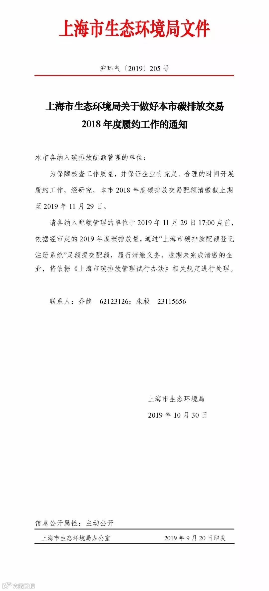 【通知】上海市生态环境局关于做好本市碳排放交易2018年度履约工作的通知