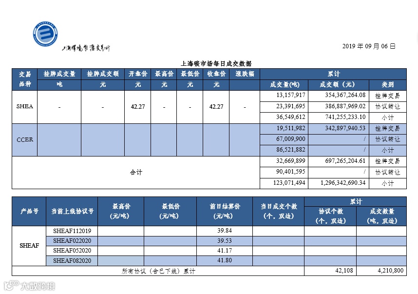 截止今日,上海碳市场所有现货品种累计成交量123,071,494吨,累计成交金额1,296,342,690.34元。其中,配额累计成交量36,549,612吨,成交金额741,255,233.10元。CCER累计成交量86,521,882吨。上海碳配额远期产品累计成交数量4,210,800吨。