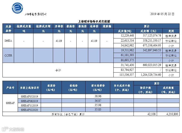 截止今日,上海碳市场所有现货品种累计成交量115,536,357吨,累计成交金额1,204,529,734.60元。其中,配额累计成交量34,842,982吨,成交金额675,336,404.93元。CCER累计成交量80,693,375吨。上海碳配额远期产品累计成交数量4,210,800吨。