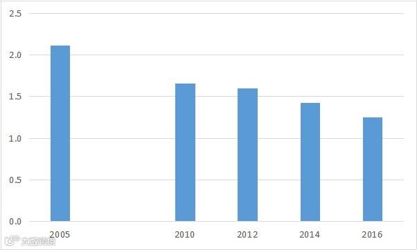 图3 2005-2016年单位GDP二氧化碳排放(吨CO2/万元,GDP采用2015年价格)