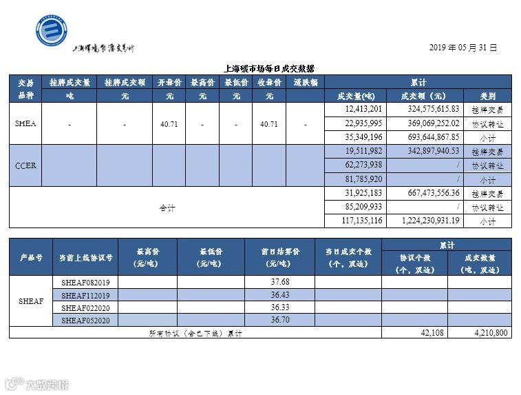 截止今日,上海碳市场所有现货品种累计成交量117,135,116吨,累计成交金额1,224,230,931.19元。其中,配额累计成交量35,349,196吨,成交金额693,644,867.85元。CCER累计成交量81,785,920吨。上海碳配额远期产品累计成交数量4,210,800吨。