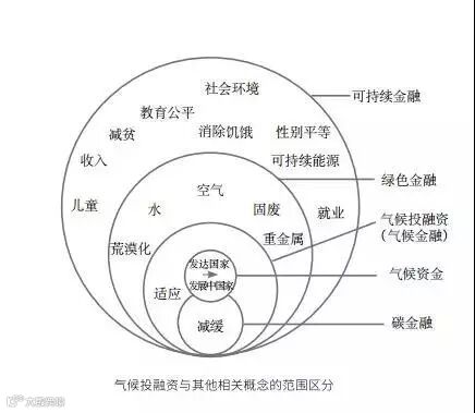 目前,“气候投融资”的概念尚无明确的界定,从现有文献来看,与气候投融资相关的概念和定义林林总总,气候资金、气候金融、绿色金融、可持续金融等概念与气候投融资都有所关联但也有所不同,其相互关系大致如图所示。
