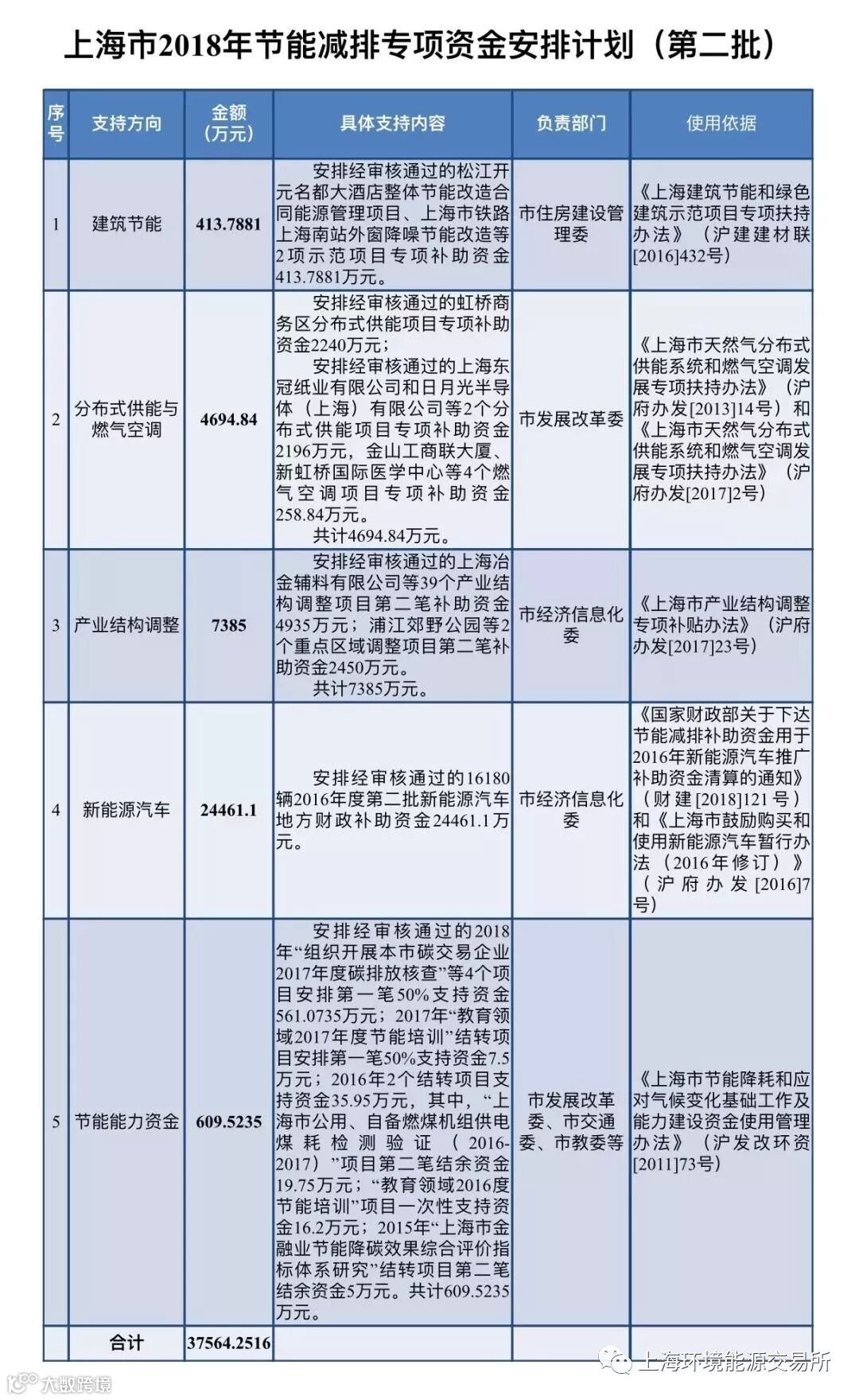 上海环境能源交易所上海市2018年节能减排专项资金安排计划(第二批)发布啦!第二批节能减排专项资金重点支持建筑节能、分布式供能与燃气空调、产业结构调整、新能源汽车、节能能力资金等5项工作,计划下达节能减排专项资金37564.2516万元,具体资金安排详见↓