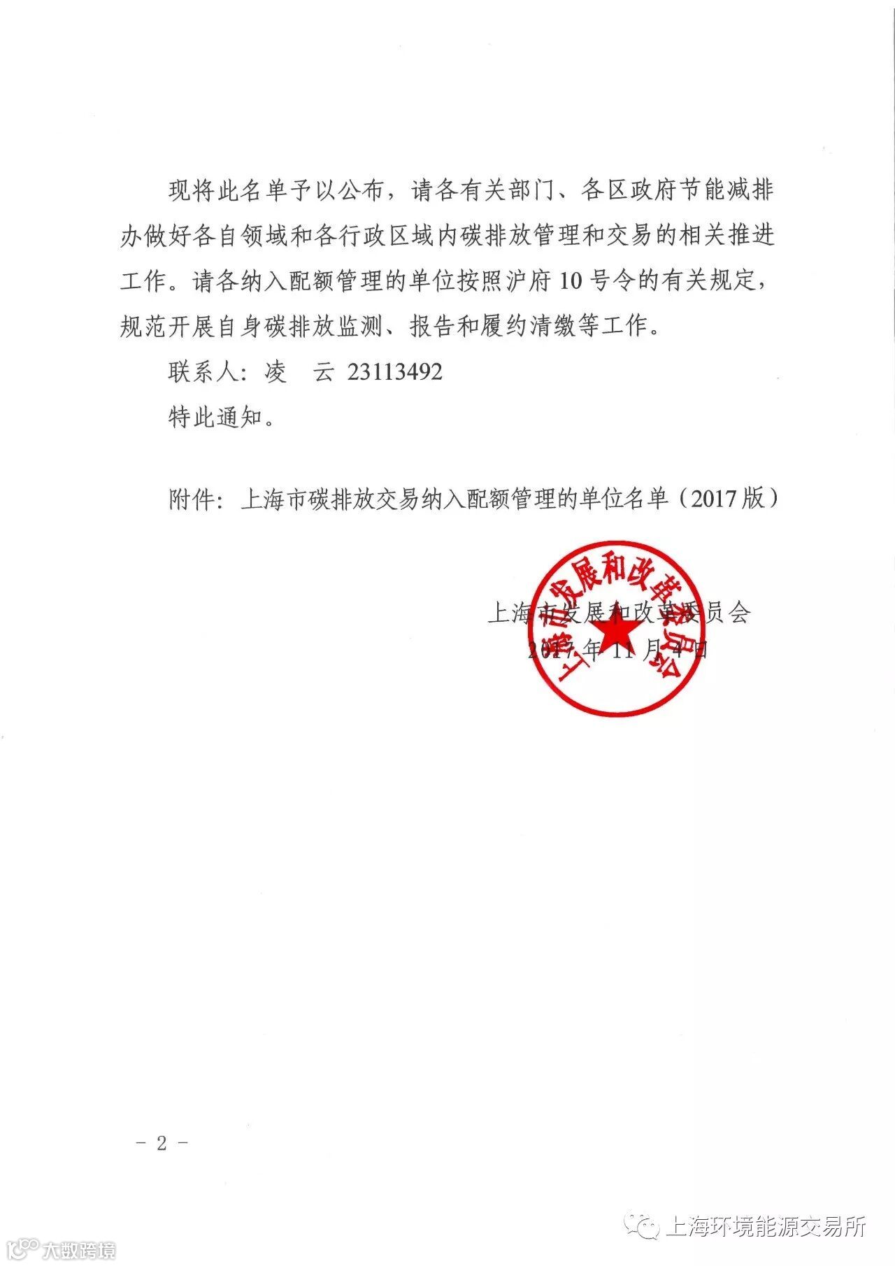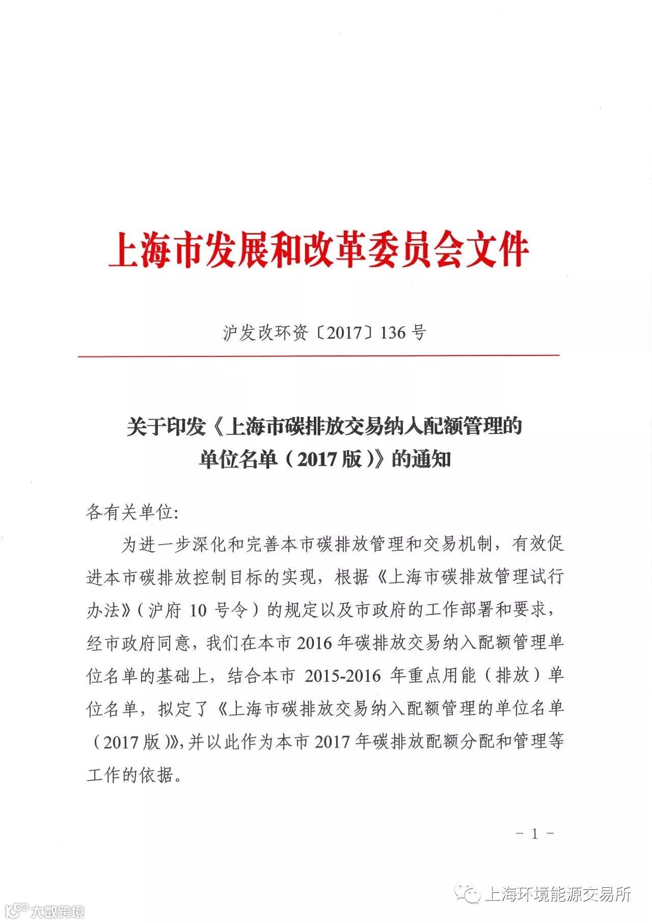 关于印发《上海市碳排放交易纳入配额管理的单位名单(2017版)》的通知