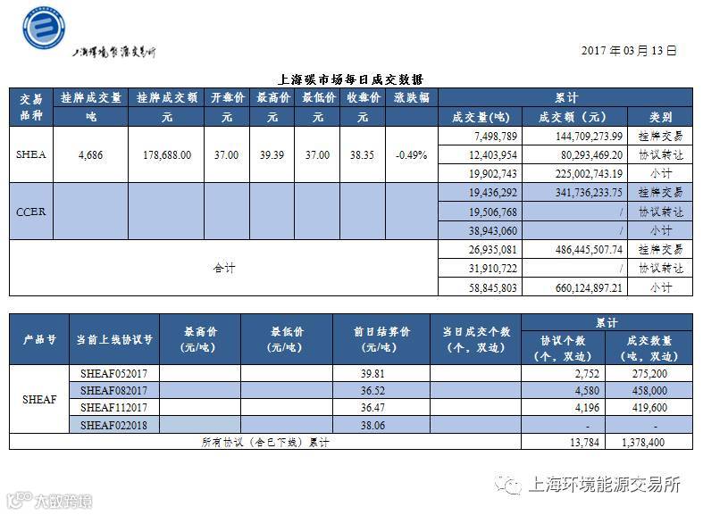 截止今日,上海碳市场所有现货品种累计成交量58,845,803吨,累计成交金额660,124,897.21元。其中,配额累计成交量19,902,743吨,成交金额225,002,743.19元。CCER累计成交量38,943,060吨。上海碳配额远期产品累计成交数量1,378,400吨。