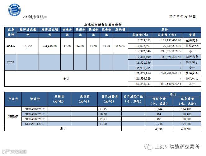 截止今日,上海碳市场所有现货品种累计成交量53,243,781吨,累计成交金额641,549,079.45元。其中,配额累计成交量17,312,546吨,成交金额211,077,032.75元。CCER累计成交量35,931,235吨,CCER挂牌交易累计成交金额341,020,627.50元。上海碳配额远期产品累计成交数量459,600吨。