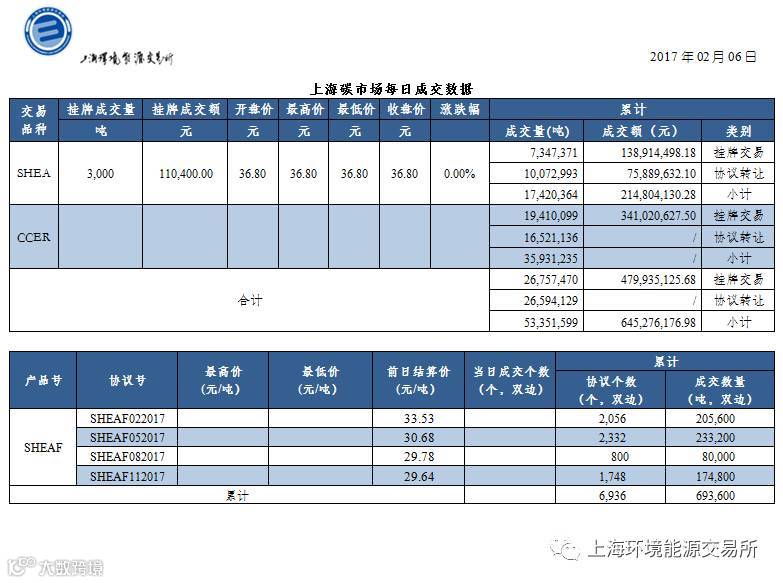 今日上海碳市场SHEA挂牌交易成交3,000吨,成交额110,400.00元,收盘价36.80元/吨,与上一交易日收盘价持平。