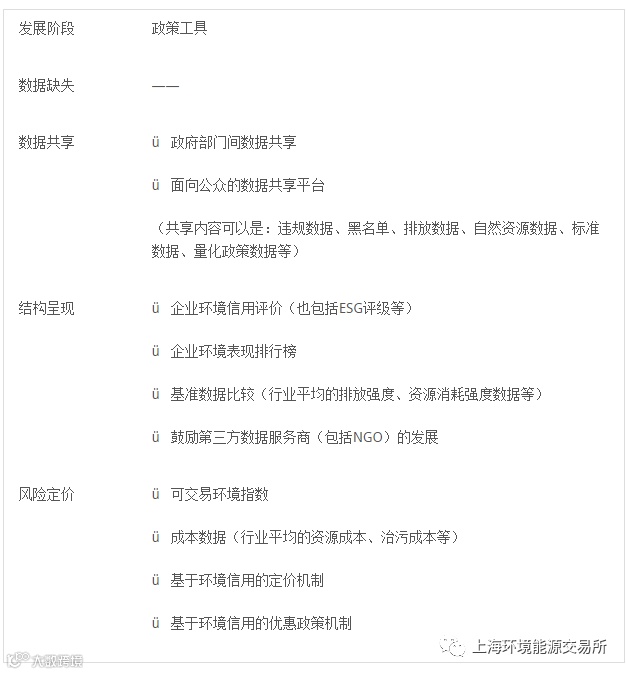 具体政策建议如下:第一,在促进企业披露环境数据的同时,重视公共环境数据,特别是“沉睡”的公共环境数据。第二,根据四阶段路线图,分析所在国家或地区所处的阶段,选择相应的政策工具(如下表),由简到繁,由浅入深。第三,设计和实施政策工具,要重视用户友好、简单、实质相关、数量化、透明等几点原则。第四,鼓励第三方数据服务商(包括专业的NGO)的发展,很多时候政府更擅长提供原始数据,但遵循市场规则运营的第三方数据服务商更擅长数据的二次开发,有效提升数据可用性和流通效率。第五,对市场各方加以引导,通过成功案例引导金融机构积极运用公共环境数据。