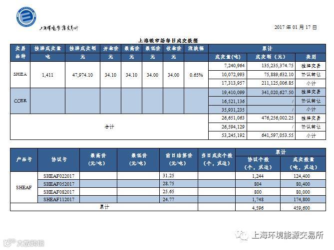 截止今日,上海碳市场所有现货品种累计成交量53,245,192吨,累计成交金额641,597,053.55元。其中,配额累计成交量17,313,957吨,成交金额211,125,006.85元。CCER累计成交量35,931,235吨,CCER挂牌交易累计成交金额341,020,627.50元。上海碳配额远期产品累计成交数量459,600吨。