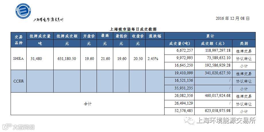 截止今日,上海碳市场所有品种累计成交量52,576,485吨,累计成交金额623,058,975.98元。其中,配额累计成交量16,645,250吨,成交金额192,586,929.28元。CCER累计成交量35,931,235吨,CCER挂牌交易累计成交金额341,020,627.50元。