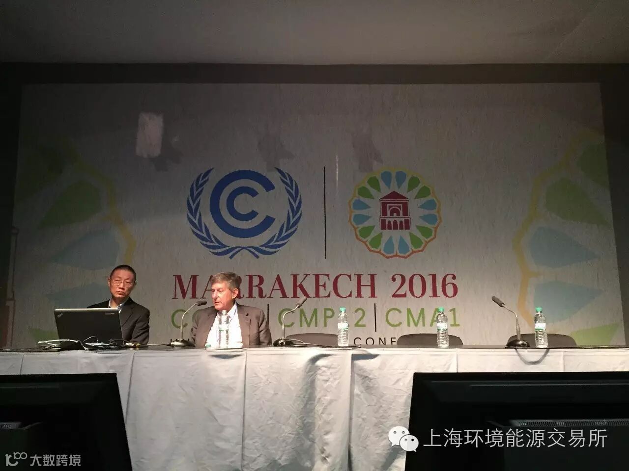 2016年11月14日,上海环境能源交易所总经理赖晓明先生一行应邀出席《联合国气候变化框架公约》第22次缔约方会议,并于摩洛哥马拉喀什当地时间2016年11月15日下午成功举办主题边会“新兴金融中心在应对气候变化中的作用:中国上海的经验”。上海环境能源交易所总经理赖晓明先生致开幕词,上海环境能源交易所总经理助理张庆先生主持边会,Climate Reality Project(气候现实项目)总裁Ken Berlin先生、联合国南南合作办公室展方案与技术交流部负责人Teresa Liu女士、杭州超腾能源技术股份有限公司常务总经理洪陈华女士、上海环境能源交易所研发中心副主任范华女士分别进行了主题发言。国家应对气候变化战略研究和国际合作中心主任李俊峰先生,以及来自约30个国家的近100位企业、金融机构、非政府组织等机构代表出席了会议,并在问答环节进行了热烈的提问。