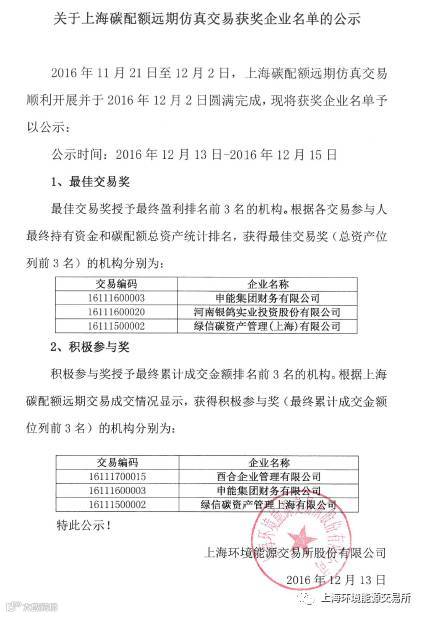 关于上海碳配额远期仿真交易获奖企业名单的公示