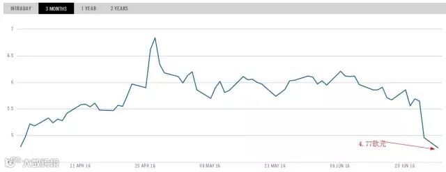 我们不妨先来看看公投后EUA价格的变化。以下为洲际交易所(ICE)近三个月EUA价格走势图,从6月23日公投当天到27日,EUA价格剧烈下跌至4.77欧元/吨,创近三个月来的新低,跌幅达17%,超过英镑近几日最大跌幅。
