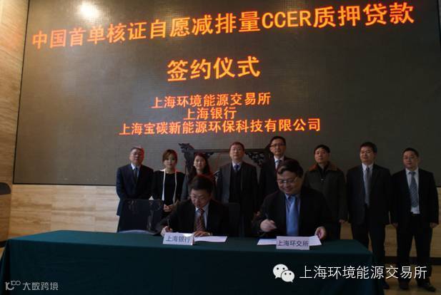 在签约仪式上,上海环境能源交易所、上海银行与上海宝碳新能源环保科技有限公司共同签署了《中国核证减排量CCER质押三方服务协议》。根据协议约定,上海宝碳新能源环保科技有限公司将通过上海环境能源交易所办理国家发改委签发的中国自愿减排量CCER的质押登记,从上海银行获得500万元贷款。该笔业务单纯以CCER作为质押担保,无其他抵押担保条件,是国内首笔有关中国核证减排量CCER质押贷款。