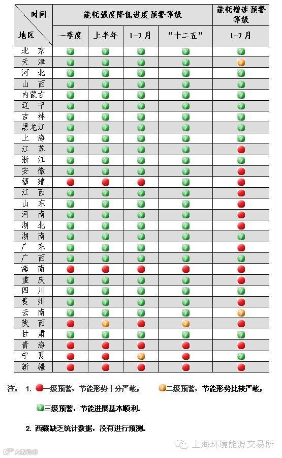 与“十二五”节能工作进度要求相比较,海南、青海、宁夏、新疆等4个地区预警等级为一级,陕西预警等级为二级,北京、天津、河北、山西、内蒙古、辽宁、吉林、黑龙江、上海、江苏、浙江、安徽、福建、江西、山东、河南、湖北、湖南、广东、广西、重庆、四川、贵州、云南、甘肃等25个地区预警等级为三级。与上半年相比,福建由二级预警下降为三级预警。