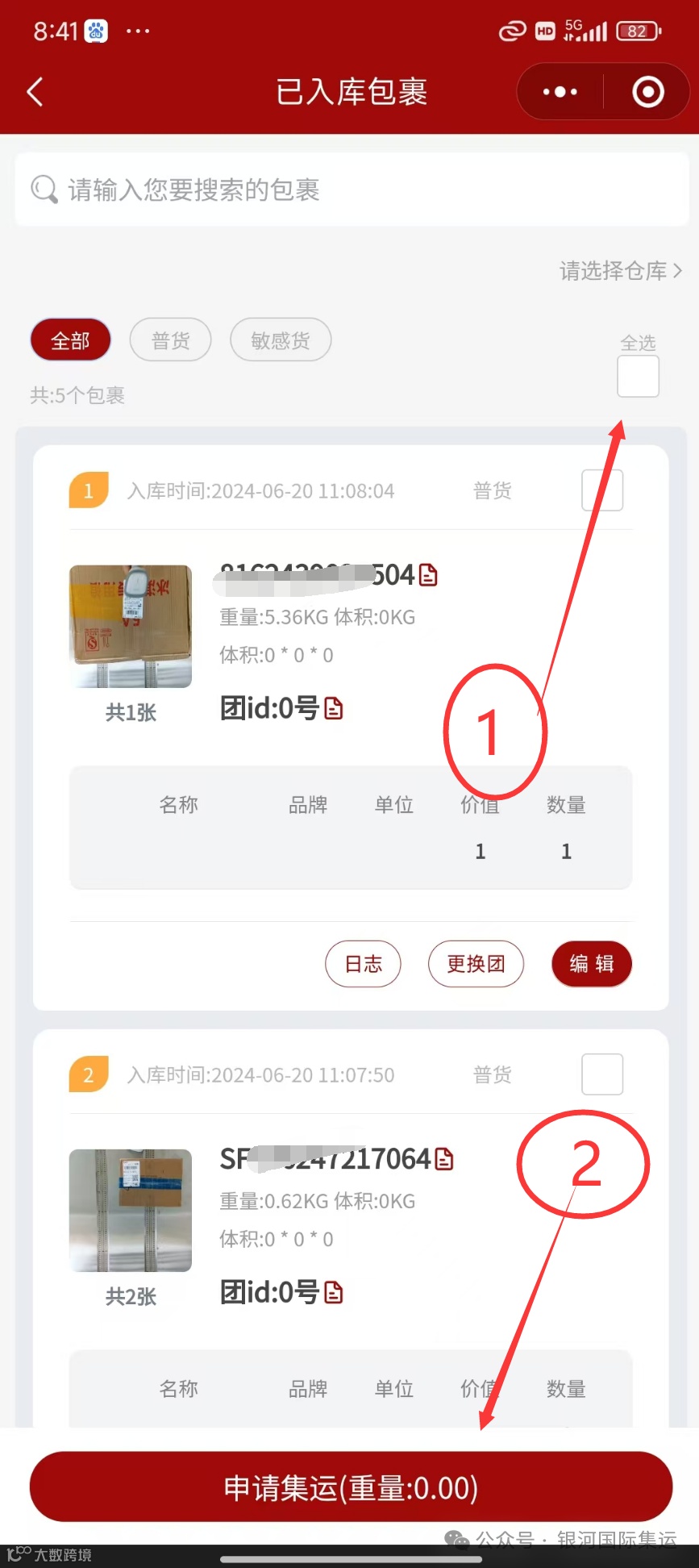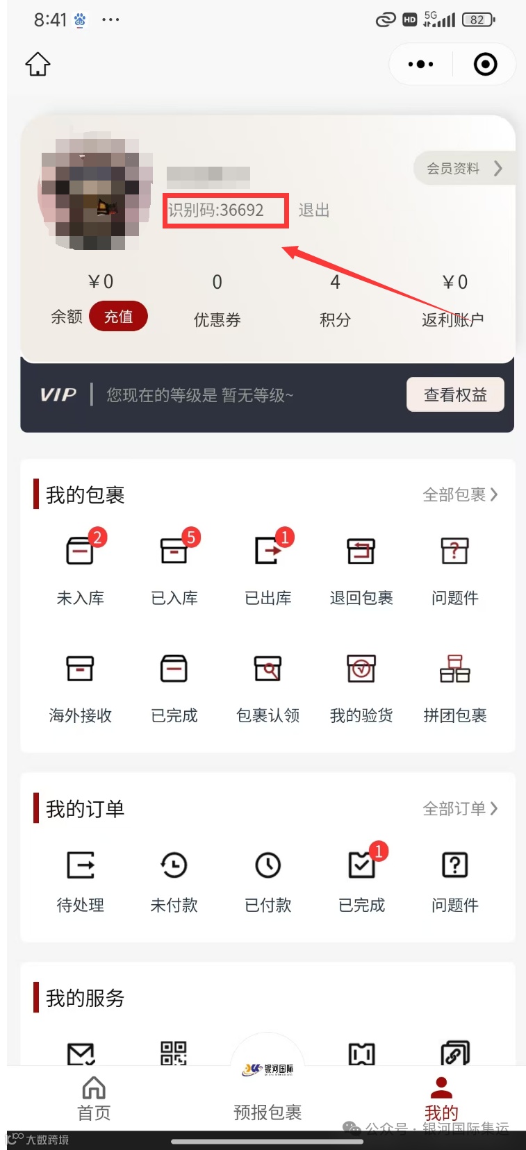 3.点击右上角未登录,然后用微信识别一下,可以看到5位数识别码,同时在此页面(已入库)选项里可以查看到到库包裹的重量,单号,和内容物照片等信息。货物到齐之后在(已入库)选项里选择需要集运的包裹,然后提交申请集运。