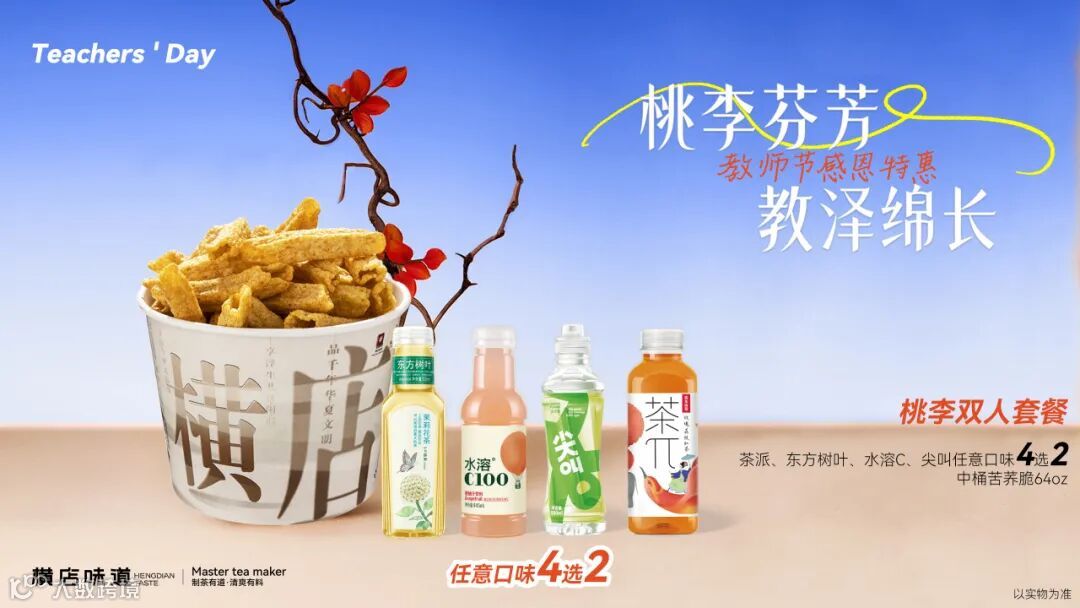「桃李双人套餐」暖心上线,茶派/东方树叶/水溶C/尖叫4款人气饮品任选2杯,搭配中桶苦养脆小食,清香解腻,敬谢师恩!