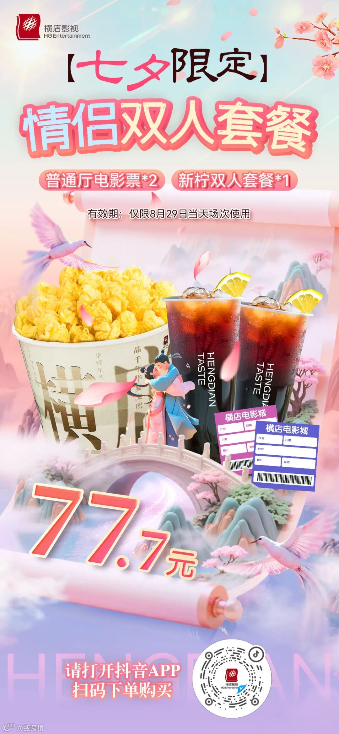 8月29日,全国横店电影城七夕限定情侣双人套餐,含两张普通厅电影票、一份新柠双人套餐。打开抖音APP,扫码下单购买。
