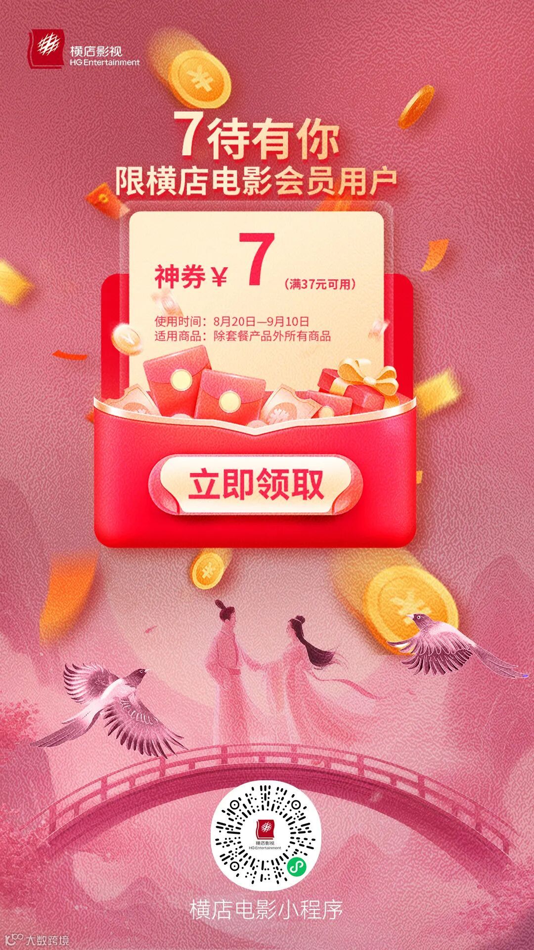 【横店电影小程序】会员可领取一次7张7元卖品优惠券,活动期间消费满37元可抵用7元一张,套餐产品不适用,仅适用于单品。