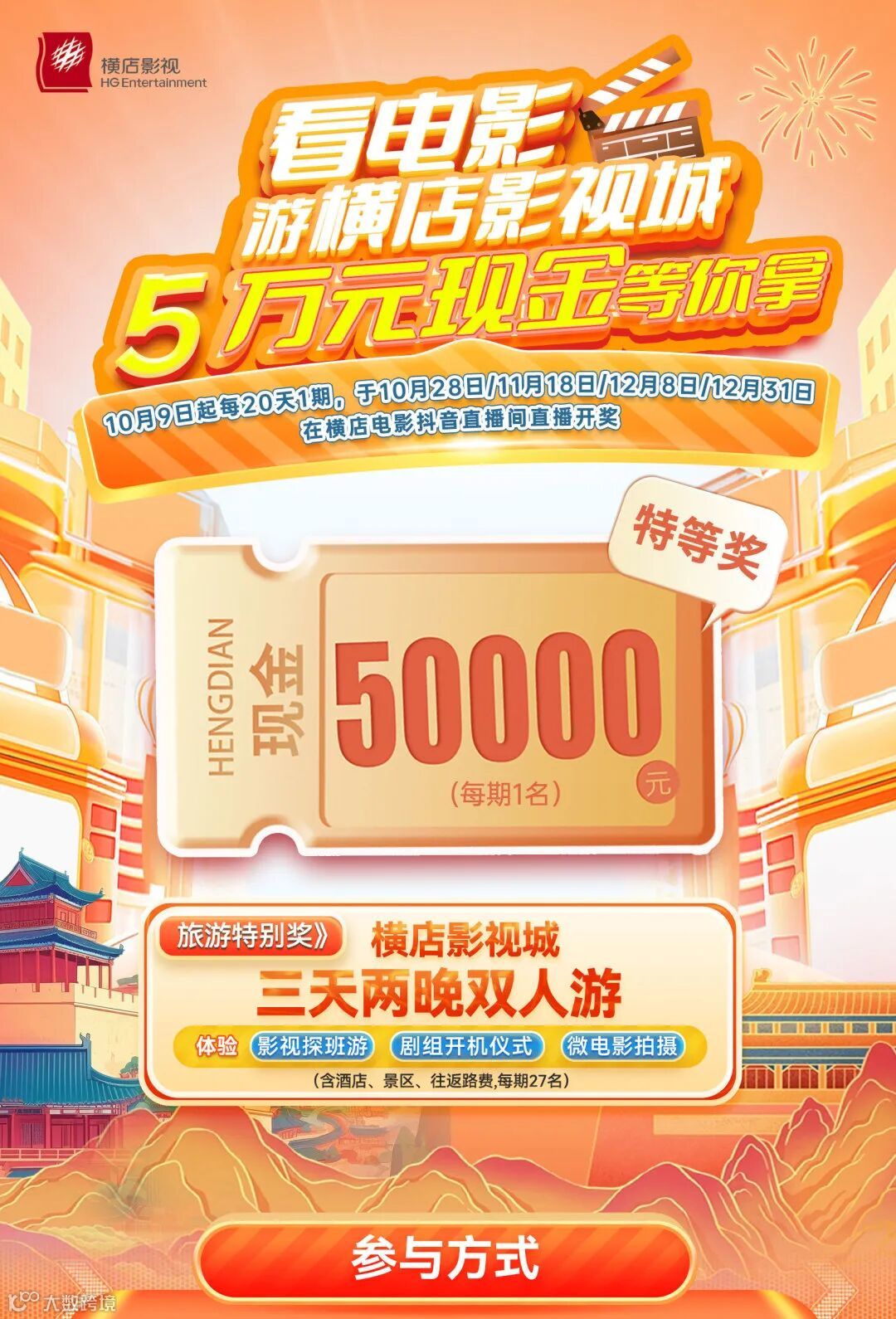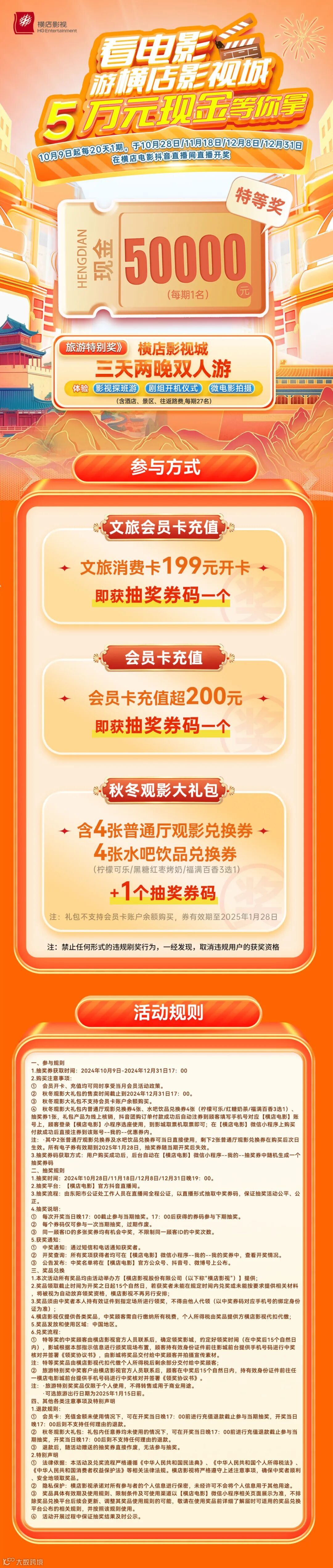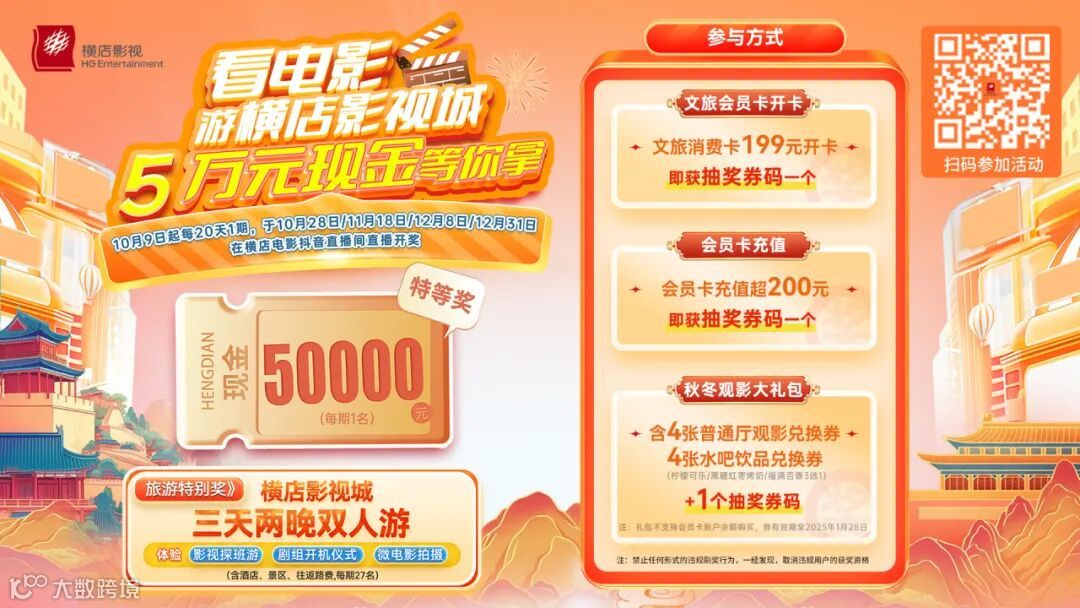 现在到横店电影小程序会员卡开卡充值或购买观影券包,即可抽取万元现金大奖!来到影视迷的胜地——横店,沉浸式体验横店影视城的非凡之旅。只需轻松参与,即有机会赢取超级大奖,机会难得!