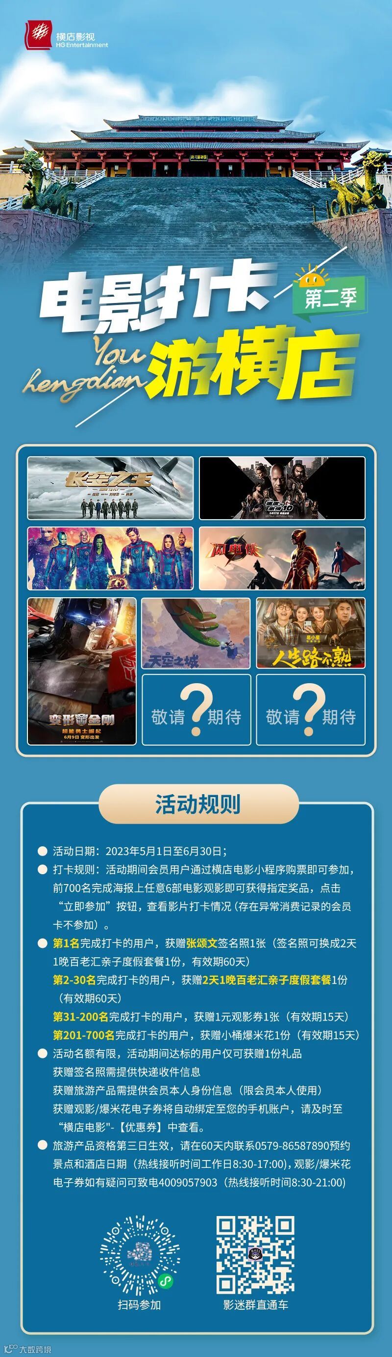 奖品含 3天2晚横店游产品、秦王宫门票、1元观影券、22.9元观影券、3元购票立减券、2元可乐券、9元小爆券、电影衍生品 等。