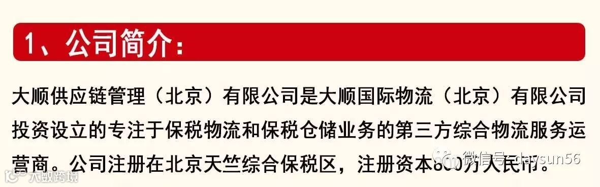 大顺公司是集国际贸易、国际货运代理、保税仓储、供应链管理和道路运输等为一体的综合型第三方国际物流公司,注册地点在北京空港物流园区,位于首都机场附近。旗下的公司包括大顺国际物流(北京)有限公司、大顺国际货运代理(北京)有限公司、大顺快运(北京)有限公司、大顺供应链管理(北京)有限公司和北京荣锦佳福国际贸易有限公司。