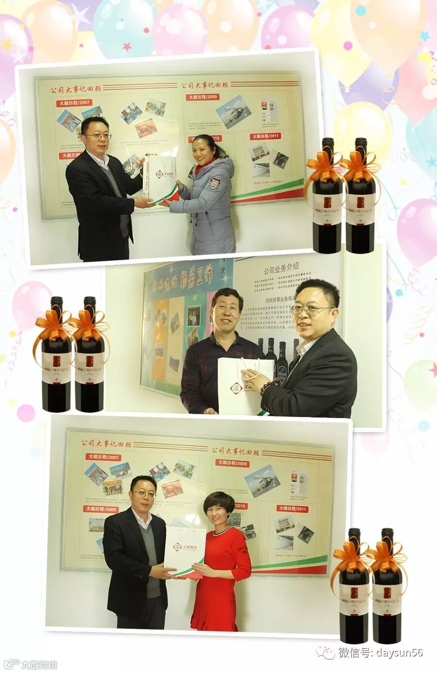 一份祝福,一份真诚,在这阳光明媚的日子里,大顺公司全体同仁祝朱寒梅、董勇、魏莹莹三位同事生日快乐!送上我们最诚挚的祝福。公司的发展倾注了您和您家人的支持、奉献,感谢您的辛勤工作,在此向您表示衷心感谢!愿我们在今后的工作中和谐、同心,共创红(hong)火长久(jiu)美好的明天!