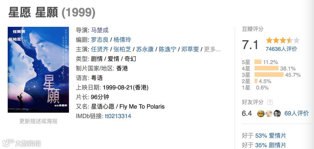 而作为导演,他的职业生涯最高峰可能是张柏芝主演的《星愿》,但搞不好不少人都以为这片叫《星语星愿》(因为同名主题曲实在太出名),那部电影其实豆瓣评分也只有7.1分,但这,却也是马楚成导演的职业生涯最高了(当然,还有刘若英那部《生日快乐》)