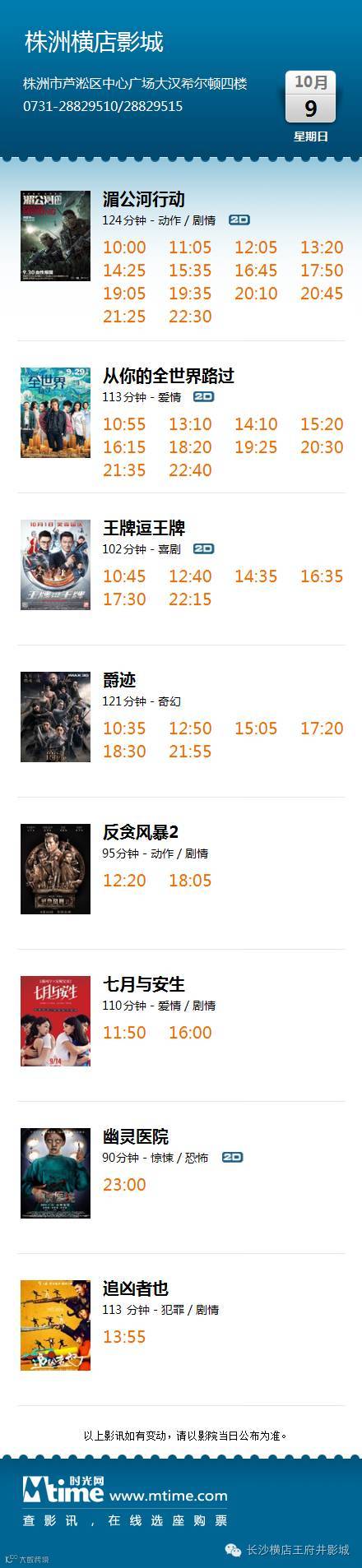 导读:今日影讯·10月9日长沙王府井 / 长沙岳麓 / 株洲 / 湘潭