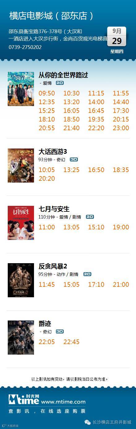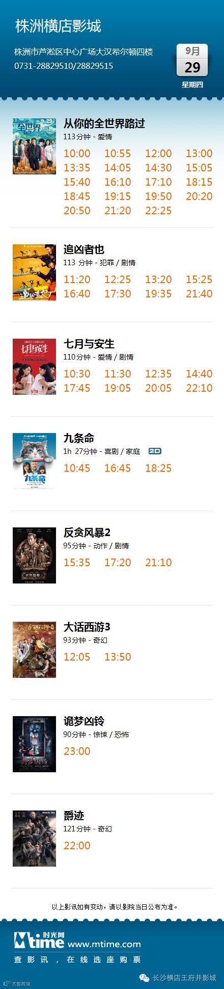 导读:今日影讯·9月29日长沙王府井 / 长沙岳麓 / 株洲 / 湘潭
