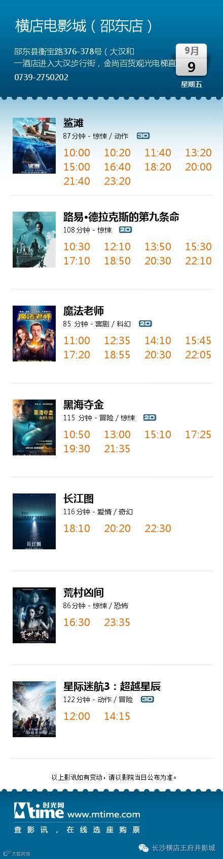 导读:今日影讯·9月9日长沙王府井 / 长沙岳麓 / 株洲 / 湘潭 / 邵东