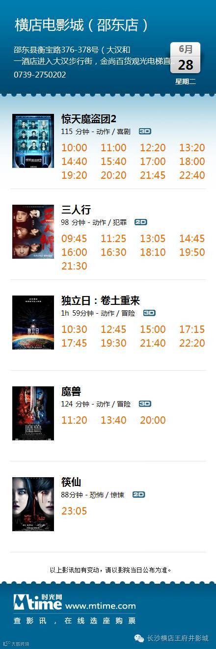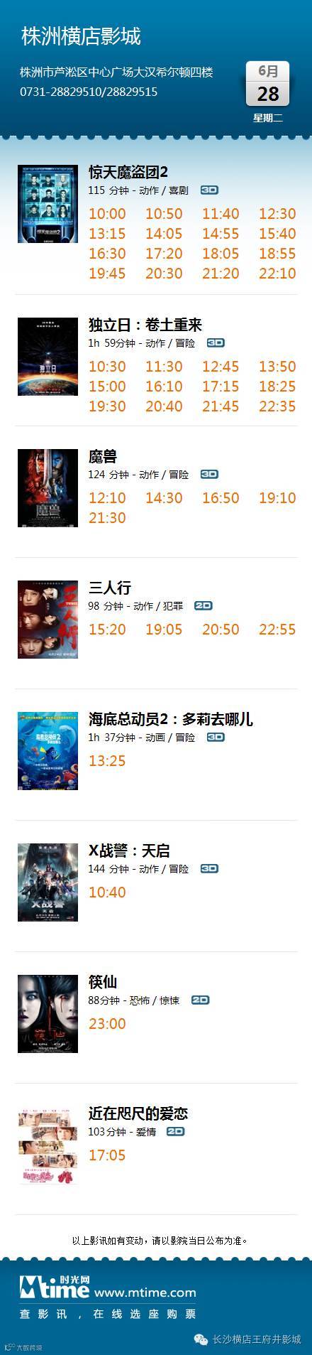导读:今日影讯·6月28日长沙王府井/长沙岳麓/株洲/湘潭/邵东