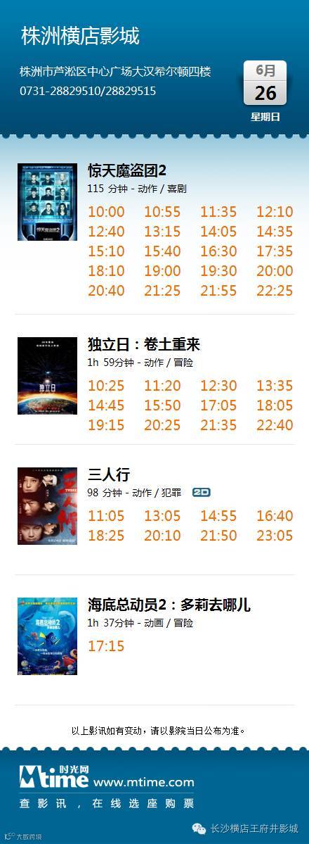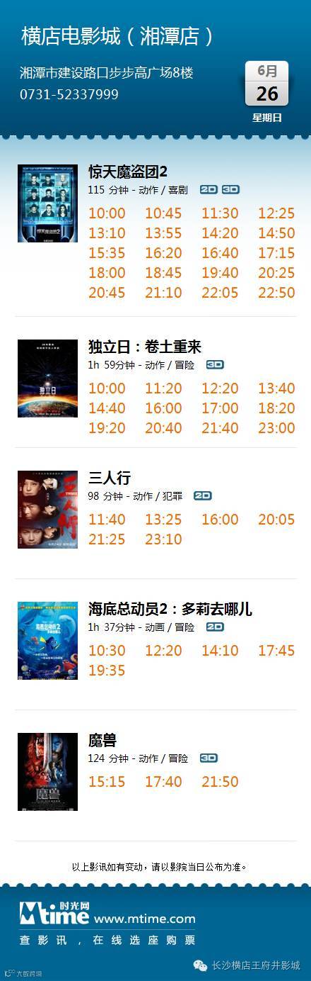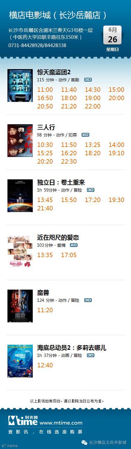 导读:今日影讯·6月26日长沙王府井/长沙岳麓/株洲/湘潭/邵东