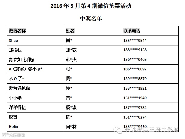 请获奖的观众于5月16日 18:50来影城检票口领取