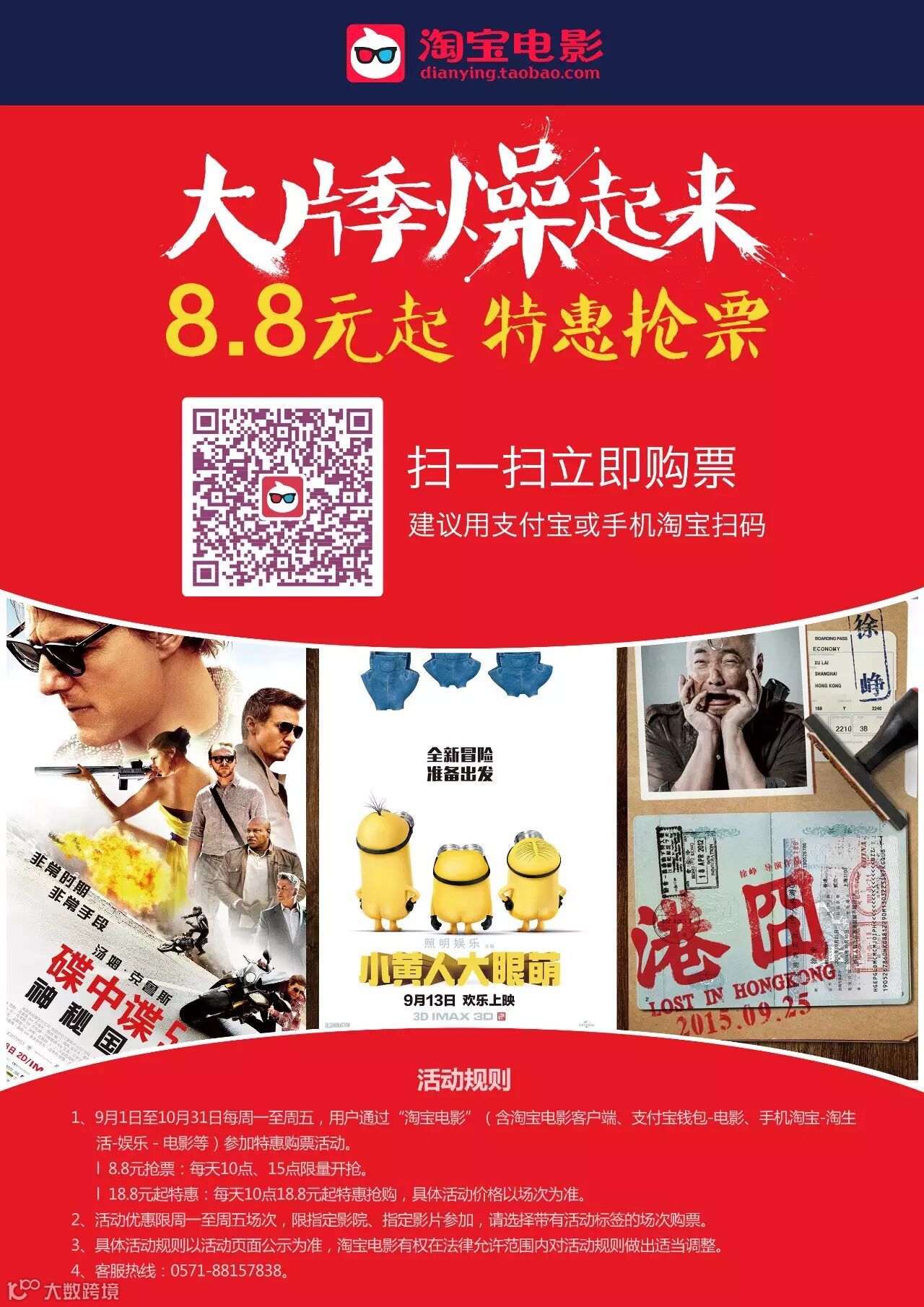 微信9月13日至20日推出黄金时段购票活动周一至周五18:30至20:00、周六\日全天享受19元购票活动,影片包括《碟中谍》、《小黄人》、《像素大战》,请及时订票产于活动!