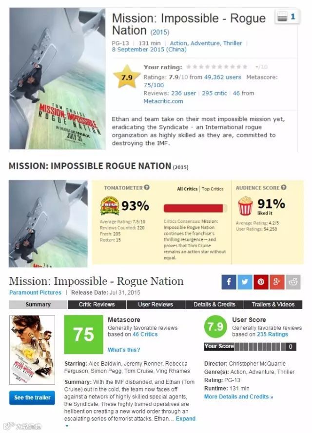 汤姆·克鲁斯主演的特工动作大片《碟中谍5:神秘国度》连续两周蝉联北美票房榜冠军,累计票房已突破了一亿美元大关。在票房走高的同时,也取得了极好的评价。目前IMDb7.9分,烂番茄93%新鲜度,不少媒体都称其为“今夏最爽的电影”。