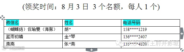 请获奖的观众于8月3日 9:00 - 17:30来影城办公室领取(过期不候,谢谢合作!)