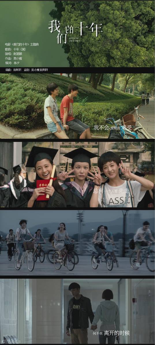 电影《我们的十年》讲述了赵丽颖在内的几对年轻人横跨十年的爱情友情纠葛,十年前和十年后截然不同的身份和状态,与陈奕迅经典神曲《十年》表达的情境非常神似,甚至可以说,电影《我们的十年》是对神曲《十年》最好的诠释和补充。赵丽颖倾情演绎《十年》,以其独特的声线和忧伤的感情,也是继《我是歌手》陈奕迅韩红合唱之后,最有特色最令人感动的一个版本。在这版《十年》MV中,电影中十年青春的画面依次呈现,其中的欢乐与甜蜜、纯真与深情,但是随着赵丽颖的歌声,都被一种伤感的情绪所包裹,带给人无限的感慨和忧伤。对此,导演马伟豪表示,“Eason是我多年的好朋友,他演绎的《十年》已成经典,不可超越,而丽颖的重新演绎,出乎我的意外,令我十分感动,几乎都看哭了,可能看着电影画面也让我想起拍这部电影的时光。”