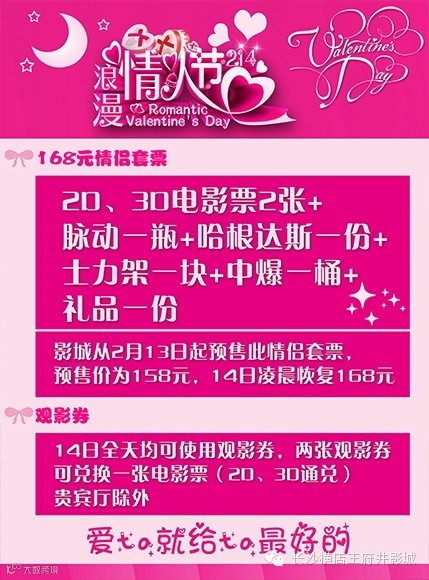 2月14日推出168元情侣套票:2D、3D电影票2张+脉动一瓶+哈根达斯一份+士力架一块+中爆一桶+礼品一份;